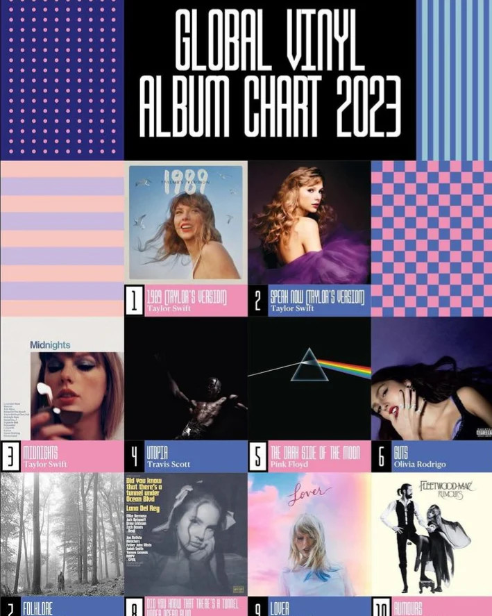 Taylor Swift possui CINCO álbuns vinis no Top 10 Global Vinyl Albums Chart da IFPI com os vinis mais vendidos de 2023 em todo o mundo, com 1989 (Taylor's Version) em 1º lugar.